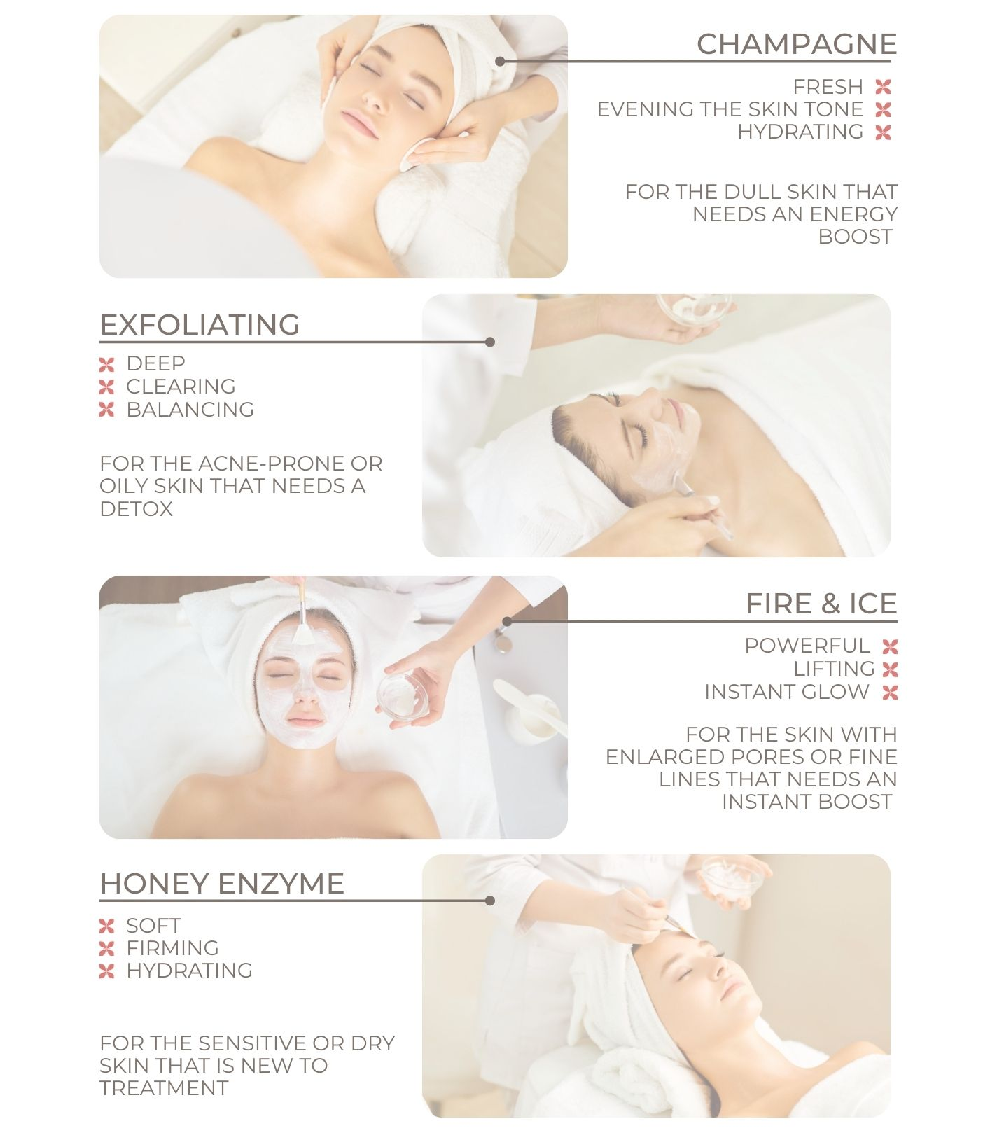 The treatment uses a unique blend of champagne, papaya, pineapple, and pumpkin enzymes to remove dead skin cells and impurities, leaving your skin radiant and refreshed. This facial is suitable for all skin types and can be customized to address your specific skin concerns.